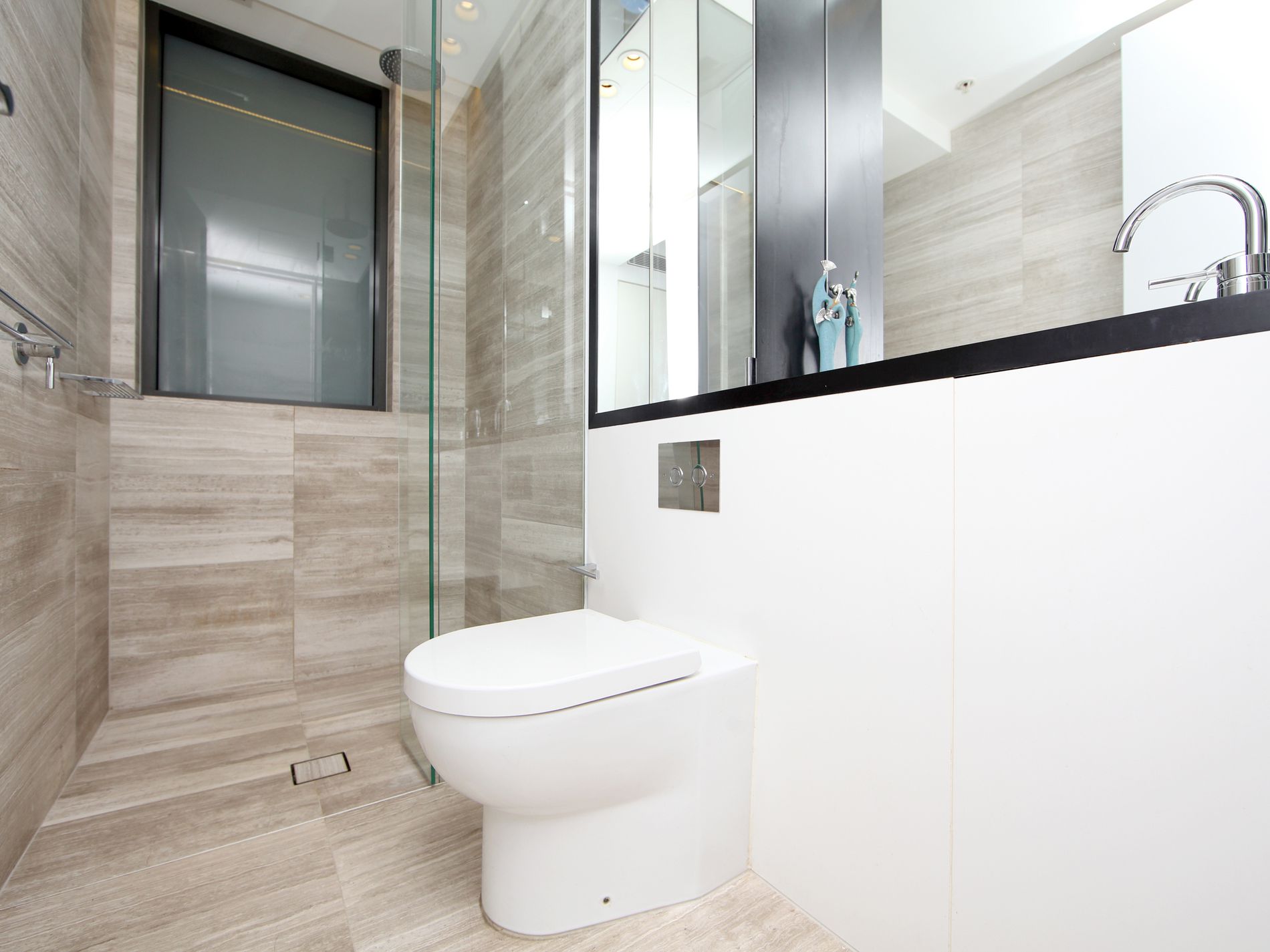 * Sleek bathroom with tiles (floor to ceiling).