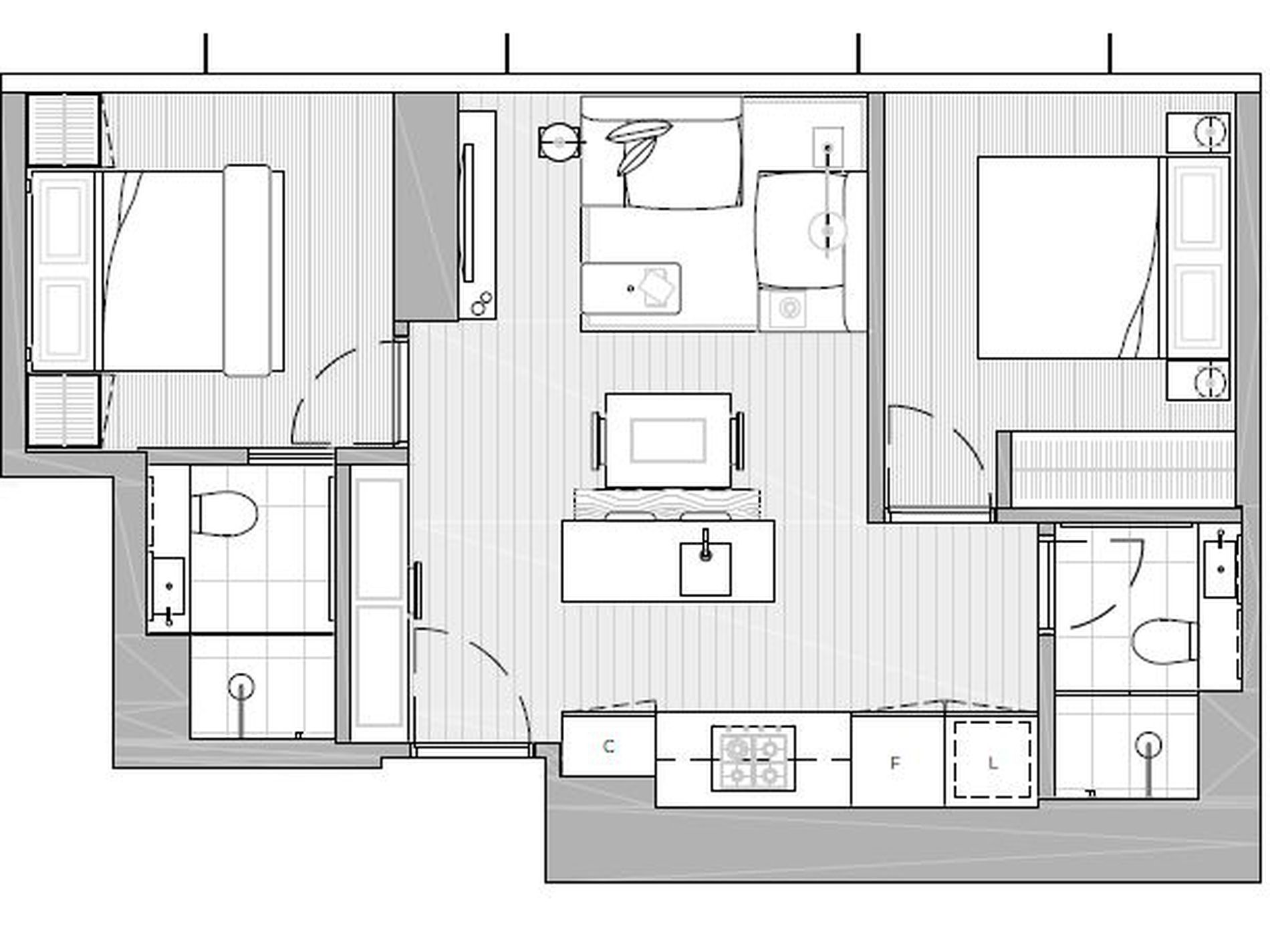 The apartment 2210 is a two bedroom, two bathroom apartment with floor to ceiling windows in every room allowing plenty of natural lights into every space. Timber flooring at the living, kitchen, and dining area. Two air-conditioning units in living room and master bedroom.