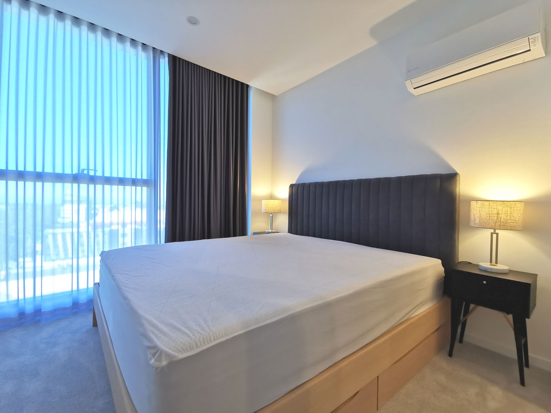 This gorgeous-looking apartment has been well furnished with quality furniture and appliances featuring a solid king and a queen bed with storage, a marble top dining table with sleek dining chairs, a lounge sofa to enjoy the Sony Android TV, LG fridge, microwave, Bosch washing machine, and Bosch heat-pump dryer.